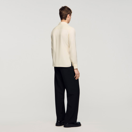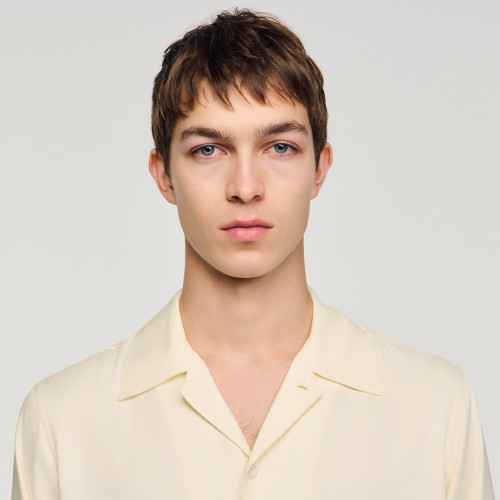 Loose-fit shirt with long sleeves with buttoned cuffs, a shark collar and a button fastening.