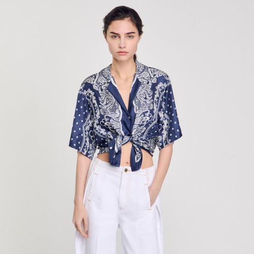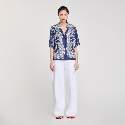 Satin-effect shirt with bandana motif, featuring a lapel collar, short sleeves and a button-down collar.