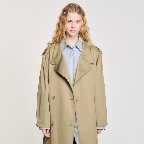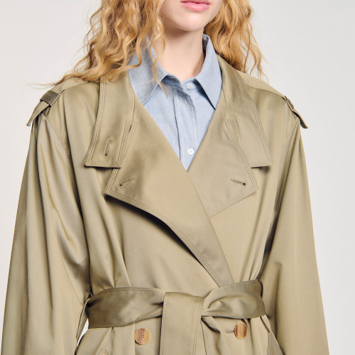 Trench coat with wide lapel collar, long sleeves, back vent and removable waist belt.