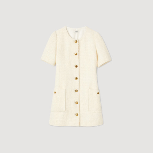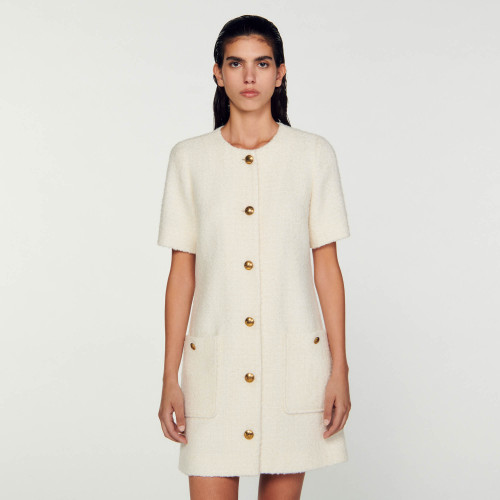 Coat-style short tweed dress with round neck, short sleeves and decorative button fastening.