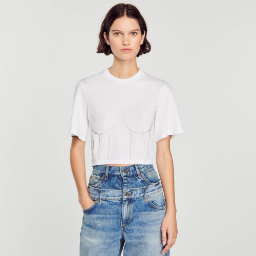 Cropped cotton T-shirt with a round neck, short sleeves, and a bustier-shaped rhinestone design.