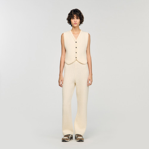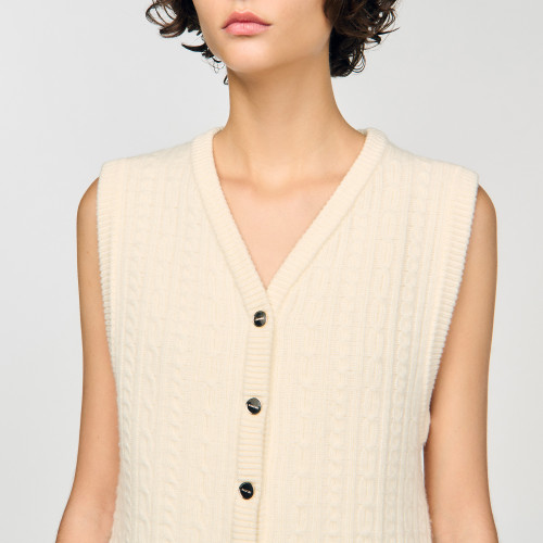 Cable knit waistcoat with a V-neck and button fastening.