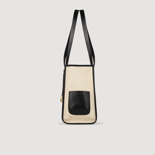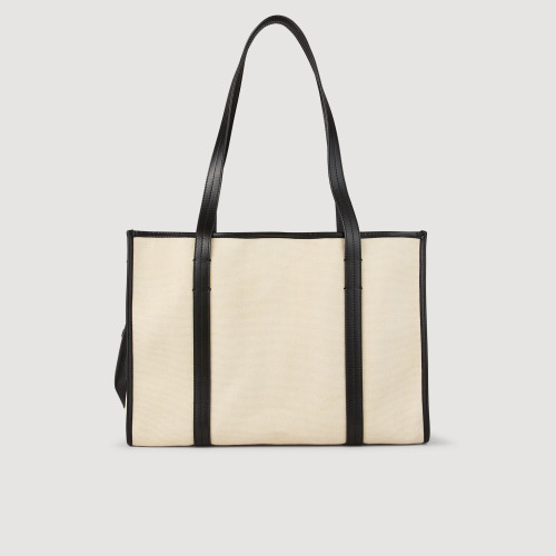 Canvas tote bag with leather shoulder straps.