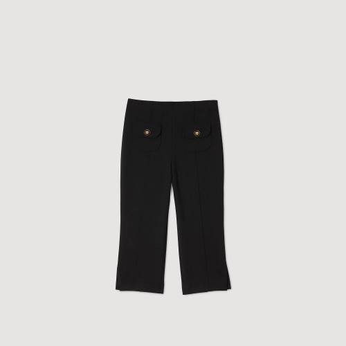 Stretch capri trousers with side slits at the hem, featuring buttoned flap patch pockets and a side zip fastening.