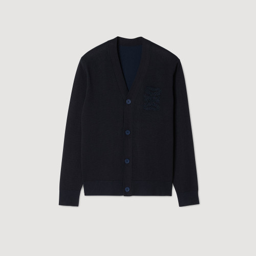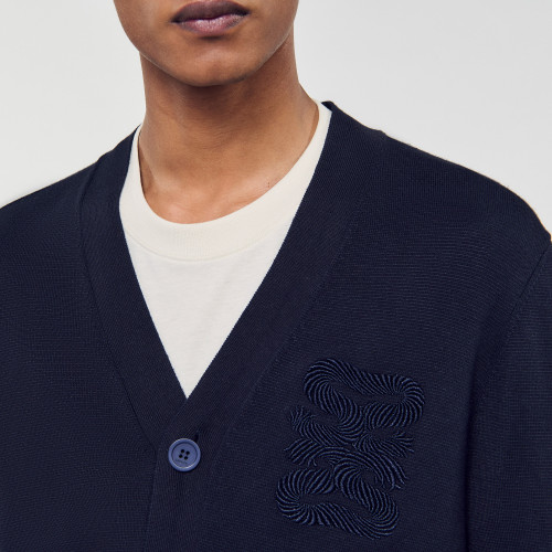 Fine knit cardigan with V-neck, long sleeves and signature code embroidery on the chest.