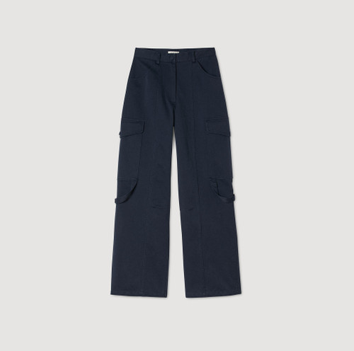 Wide-leg cargo trousers with large flap pockets and side straps.