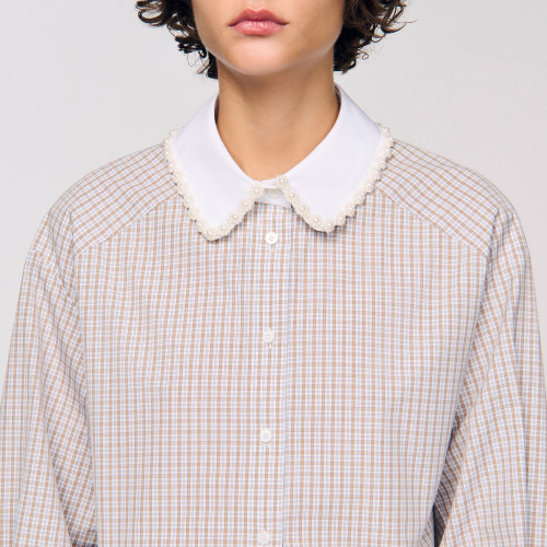 Check shirt with a contrasting pearl-embroidered collar, long sleeves with buttoned cuffs and a button fastening.