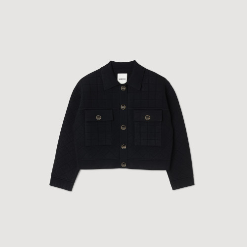 Cropped cable-knit cardigan in wool and cashmere with a shirt collar, long sleeves and a zip fastening with a pearl pull.