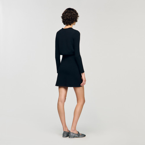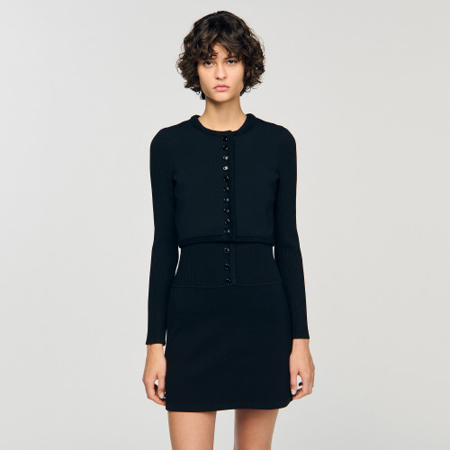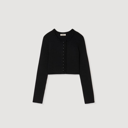 Cropped rib knit cardigan with round neck and long sleeves, with button fastening.