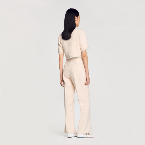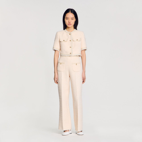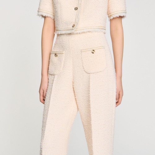 High-waisted straight-leg trousers in decorative tweed, with braided trim on the waistband and pockets.