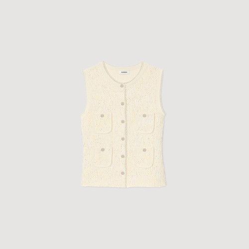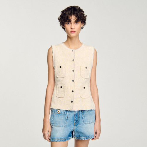 Sleeveless decorative tweed waistcoat with sequins, round collar, button placket with pearl buttons, buttoned patch pockets.