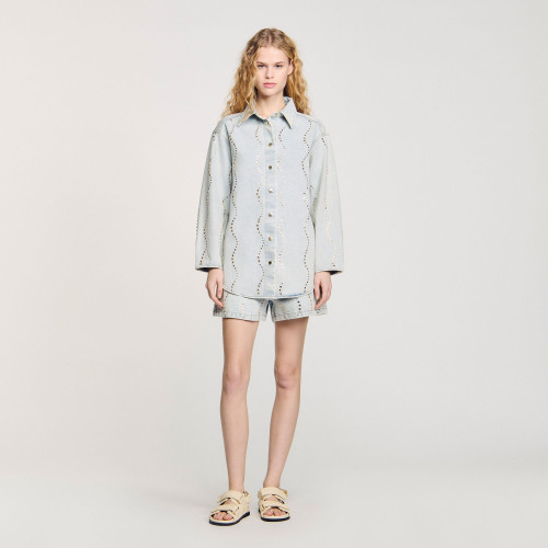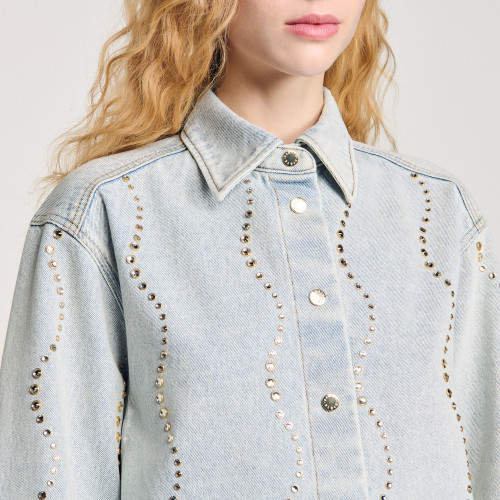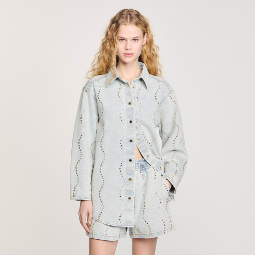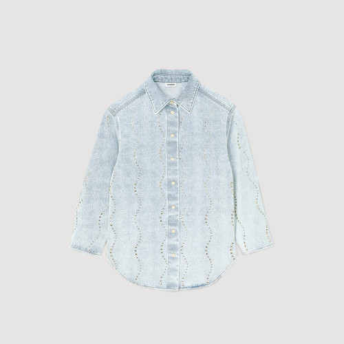 Long denim shirt with rhinestone detailing in vertical waves, featuring a classic collar, long sleeves and a press stud placket.
