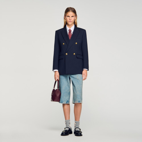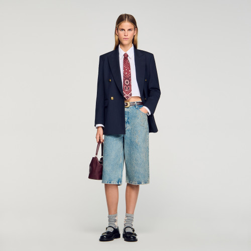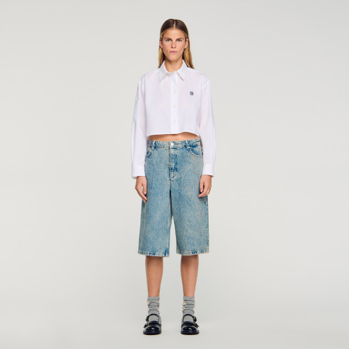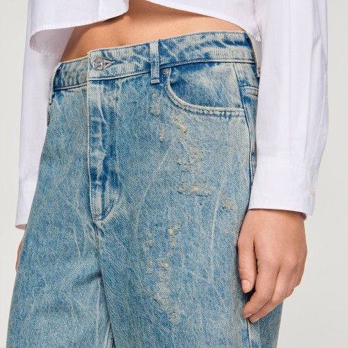 Denim Bermuda shorts with a worn and ripped effect, featuring five pockets and a standard waist.