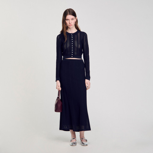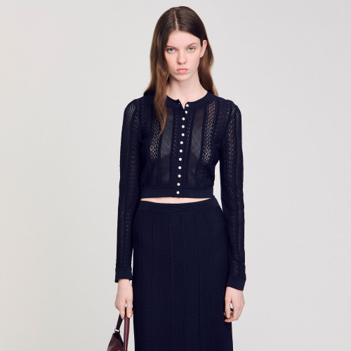 Striped knit cardigan with long sleeves, ribbed cuffs and waistband, and button fastening.