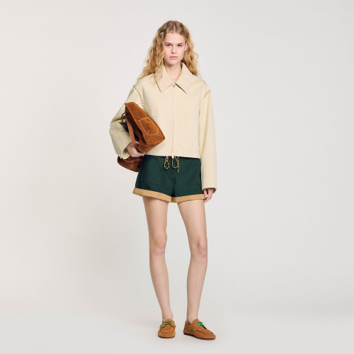 Gabardine jacket with corduroy collar, long sleeves with beaded detail on armholes, zip fastening and patch pockets.