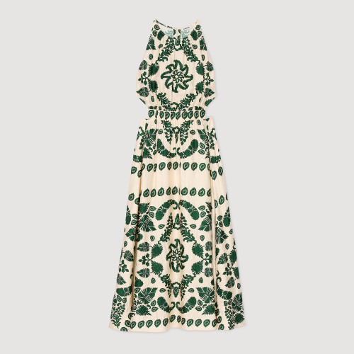 Sleeveless satin-effect maxi dress with leaf motif, round neckline, cutaway sides and slightly flared skirt.