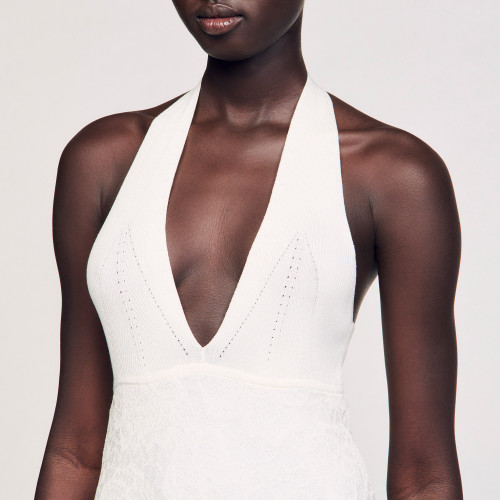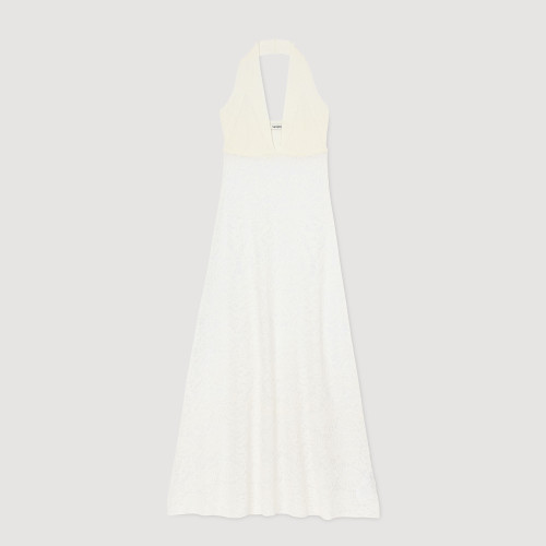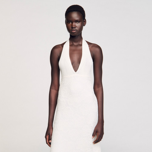 Long backless dress in fine decorative knit, with a plunging neckline and flared hem.