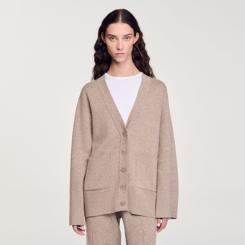 Long, loose-fit knit cardigan with rhinestone embellishments, button fastening, long sleeves and front patch pockets.