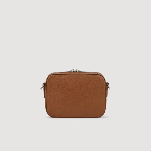 Small grained leather bag with an adjustable technical shoulder strap featuring metal clasps, adorned with a silver Sandro logo.