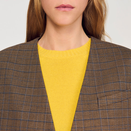 Oversized checked suit jacket without a collar, featuring long sleeves, button fastening and front pockets.