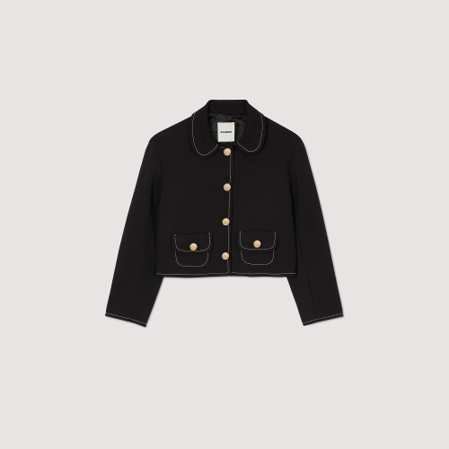 Cropped jacket with contrast stitching, Peter Pan collar, long sleeves, buttoned placket with gold buttons and patch pockets with button-down flaps.