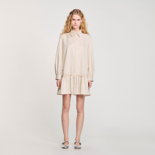 Short rhinestone dress in a striped shirt style, with classic collar, button fastening, long sleeves and ruffled skirt.