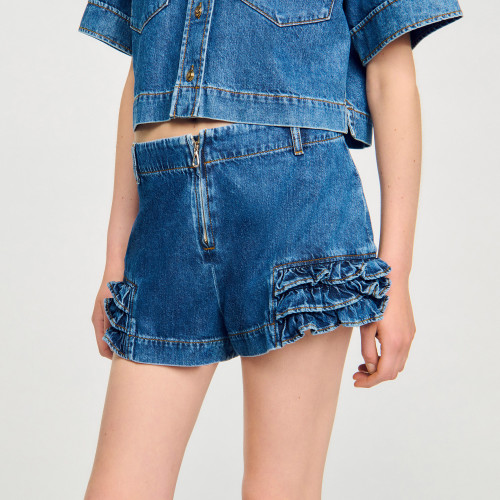 Flared denim shorts with ruffles and contrasting topstitching, featuring belt loops and a front zip fastening.