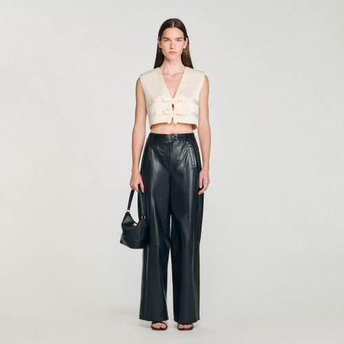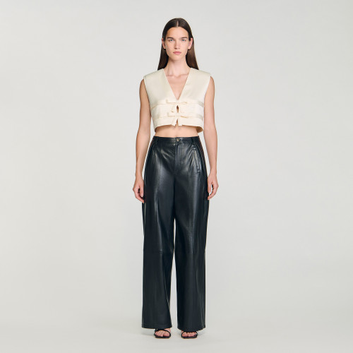 Sleeveless satin-effect crop top with V-neck, featuring flat bows and a zip fastening at the back.
