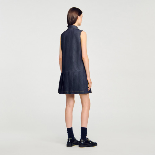 Sleeveless short dress in raw denim with contrasting topstitching, featuring a shirt collar and button fastening with decorative buttons.