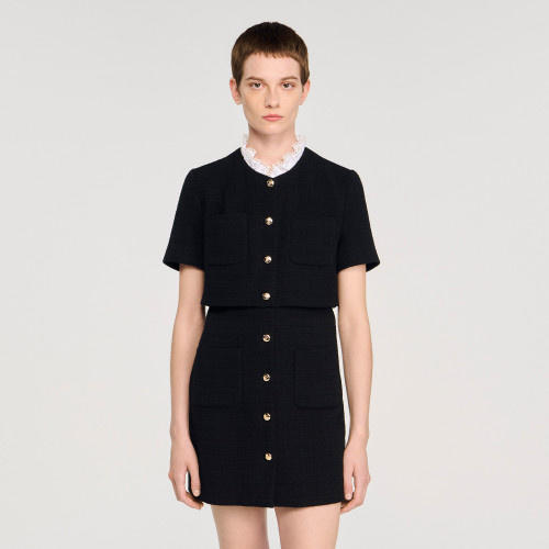 2-in-1 effect short tweed dress with removable contrasting collar, button fastening and patch pockets.
