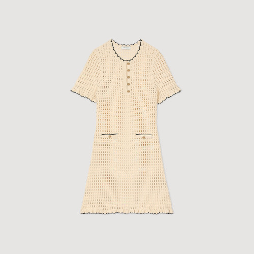 Short openwork dress with round buttoned neck, short sleeves and scalloped hem.