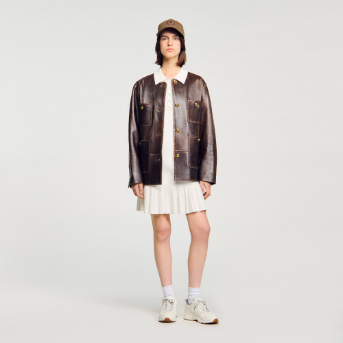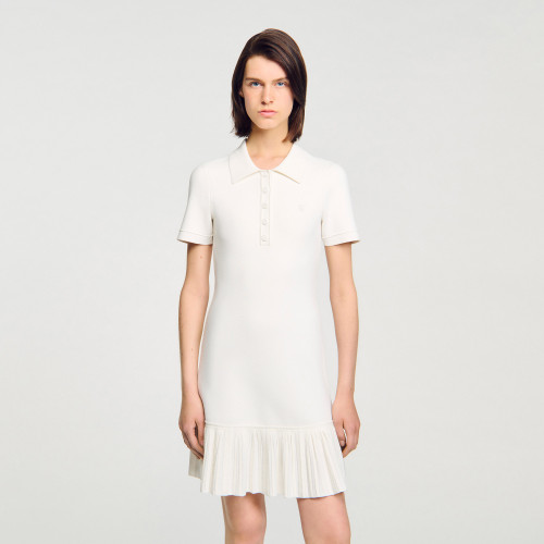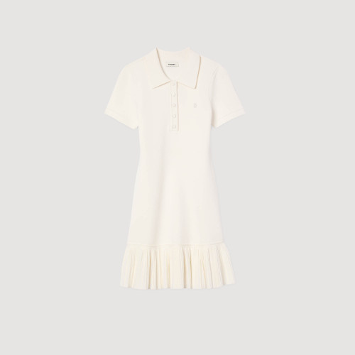 Short knit dress with short sleeves, buttoned polo collar, and pleated skirt.