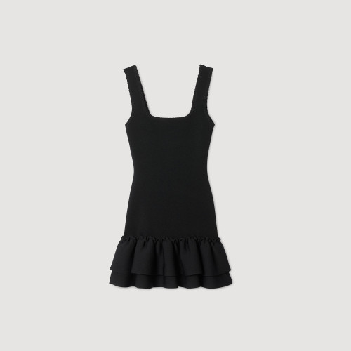 Short knit dress with wide straps, square neckline and ruffled skirt.