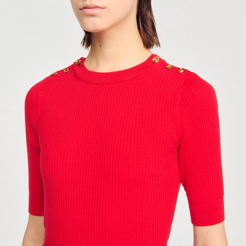 Rib knit jumper with round neck, short sleeves and embellished with a button placket on the shoulder.