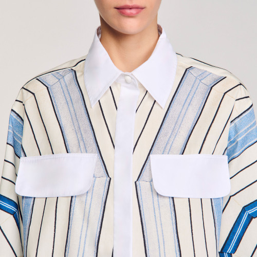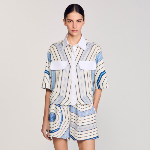 Cropped silk shirt with a spiral motif, classic collar, short sleeves, and flap pockets on the chest.