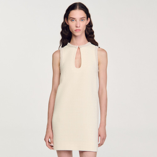 Short sleeveless tweed dress with a high, round neck, a teardrop peephole and beaded trim on the neck and sleeves.