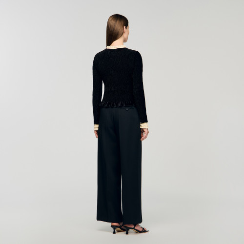 Smocked velvet jersey T-shirt with contrasting ruffled round neck and long sleeves.