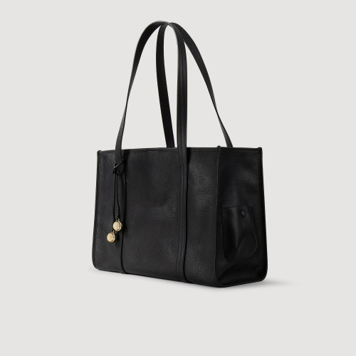 Soft leather tote bag with long shoulder straps, magnetic clasp, side pocket and charms.
