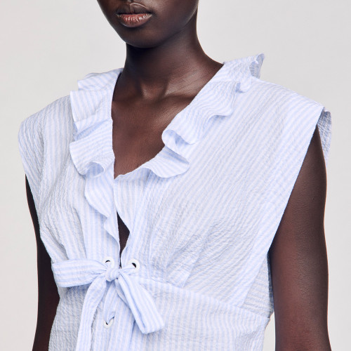 Sleeveless striped crop top with V-neck, ruffles and laces that tie at the front.
