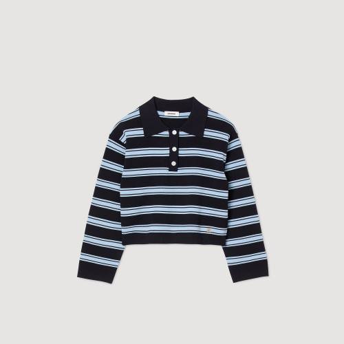 Striped fine knit polo jumper with buttoned polo collar at the front and long sleeves.