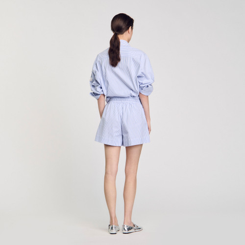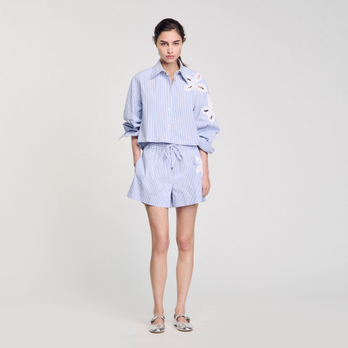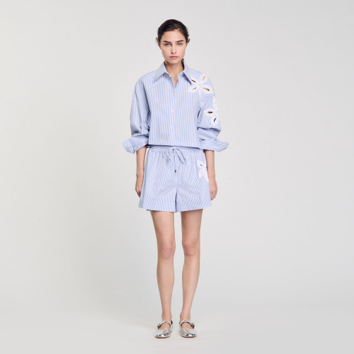 Striped shorts with elasticated tie waist and embroidered beaded and rhinestone flowers.