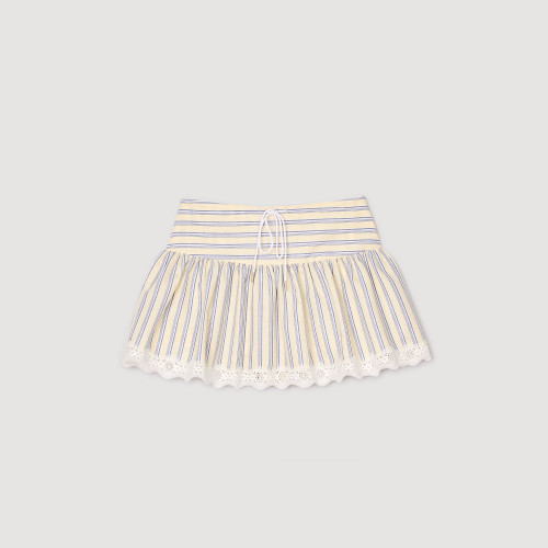 Striped shorts skirt with ties at the waist and lace trim.