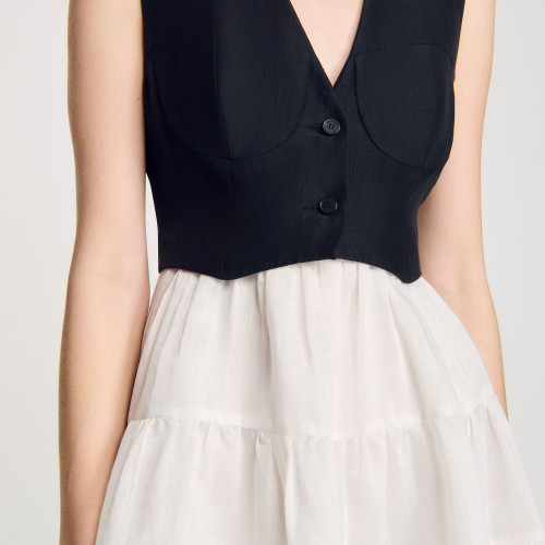 Short, two-tone dress featuring a jacket-style top with corset tailoring and a flared skirt with ruffles.
