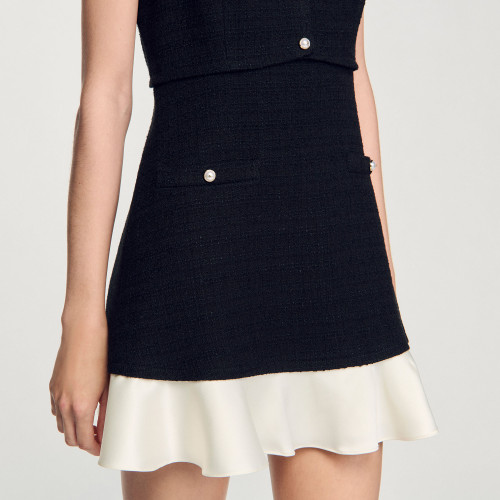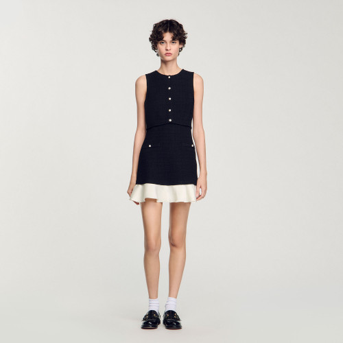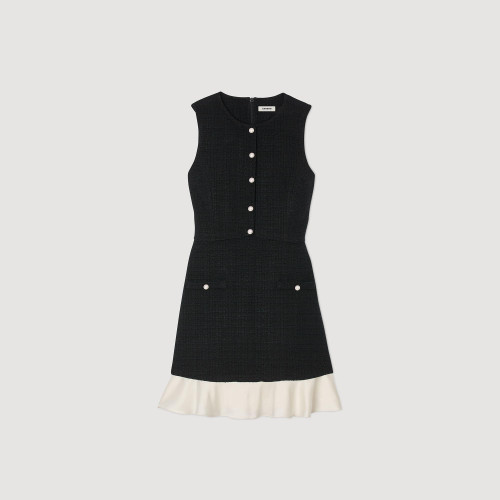 Short sleeveless tweed dress with a button placket featuring pearl-bead buttons and a contrasting ruffle at the bottom of the skirt.