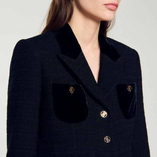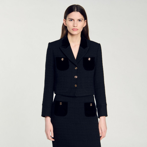Cropped velvet and tweed jacket with long sleeves, button fastening and patch pockets on chest.