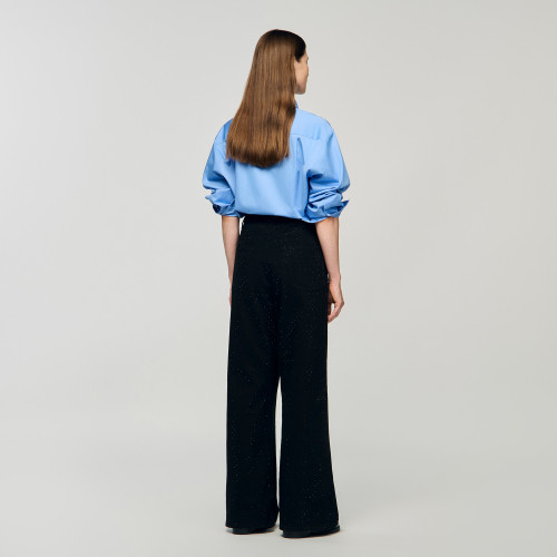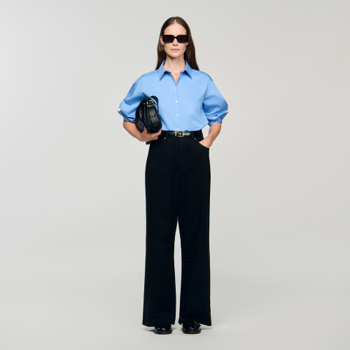 Wide-leg canvas jeans embellished with rhinestones, featuring five pockets and belt loops.