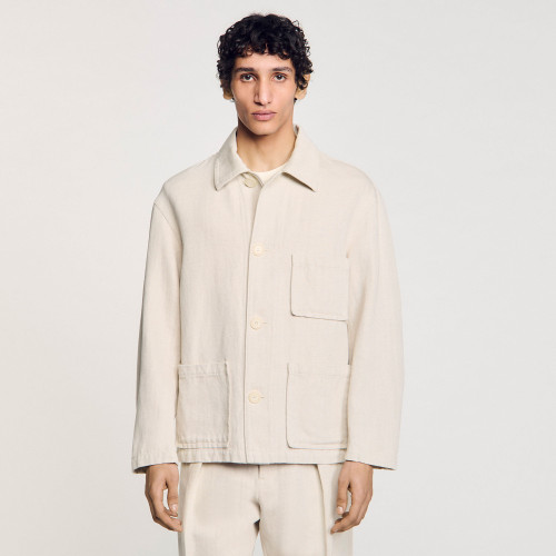 Worker jacket with patch pockets, long sleeves and a button placket.