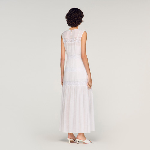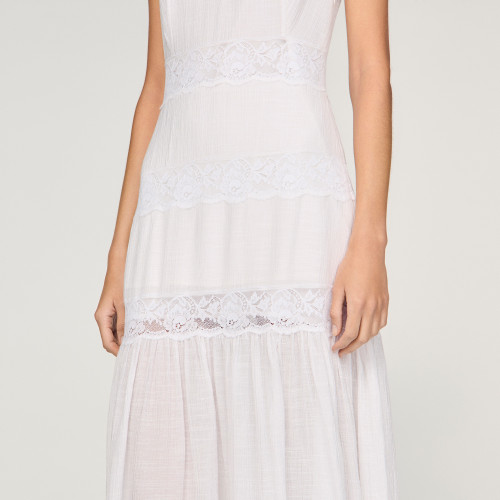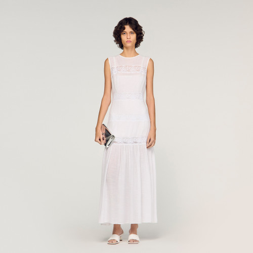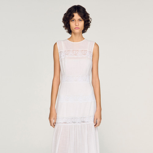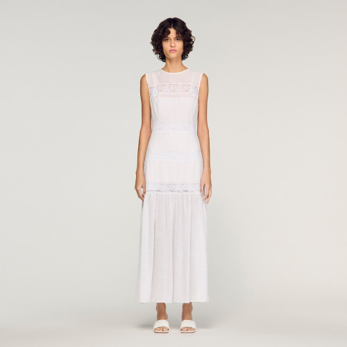 Straight-cut long crepon dress with lace trim, round neckline and side zip fastening.