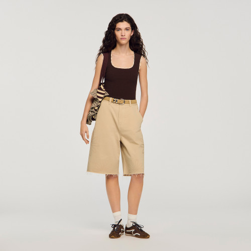 Sleeveless ribbed knit top with contrasting crochet trim and scooped round neckline.