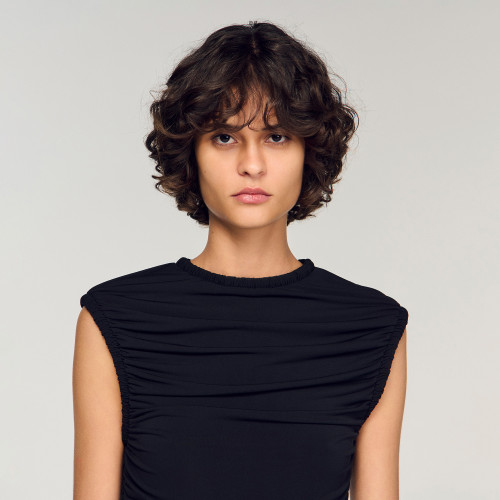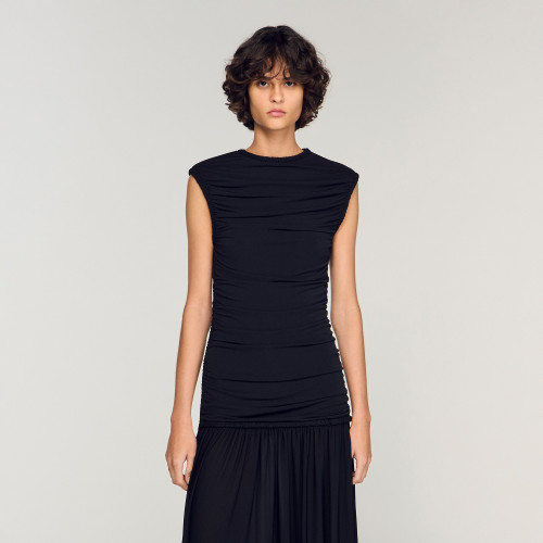 Flared draped jersey maxi dress with round neckline and intricate details.